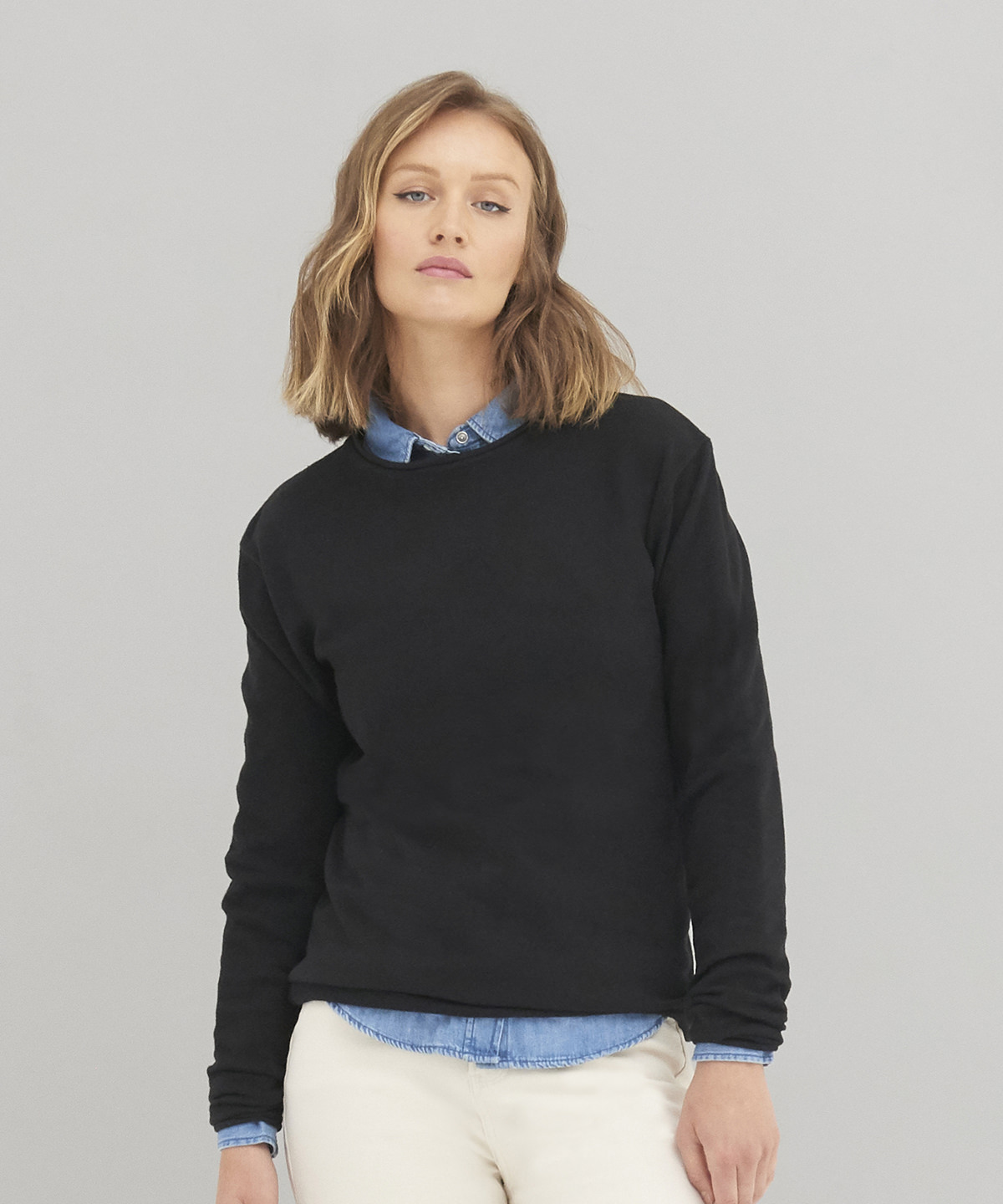 Lightweight sweater made from regenerated cotton. Set-in sleeves with rolled cuffs , hem and collar. SEDEX certified. Vegan certified. BSCI certified. Oeko-Tex certified.