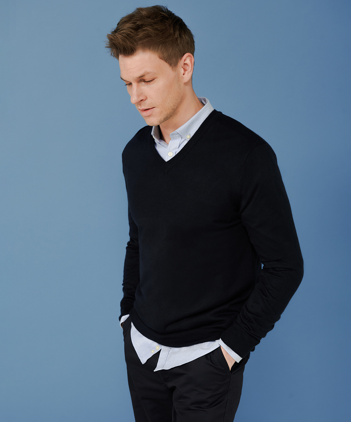 Cashmere touch acrylic yarn. Anti-pill. Smooth and soft finish. 12 gauge knitwear. Semi fashioned sleeve and neck. 1×1 ribbed hem, neck and cuffs. SEDEX certified. Oeko-Tex certified. BSCI certified.